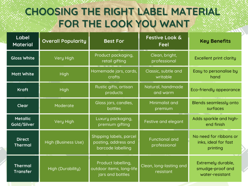 If you’re printing at home or designing labels for gifting, postal dispatch, storage or seasonal branding, here’s a simple comparison to help you decide which material works best.